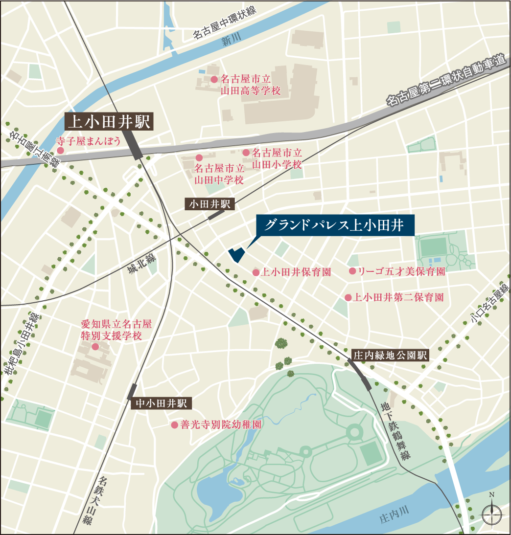 「庄内緑地」をはじめ、家族で楽しめる公園が点在。